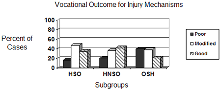 Vocational outcomes in relationship to injury mechanisms showed that those injured by an object striking the head (OSH) had significantly worse outcomes than the head striking object (HSO) group. A similar trend for OSH and head not striking object (HNSO) was observed, but statistical significance could not be assessed because of sample size. The researchers found no difference in the HSO and HNSO groups. The following chart illustrates the results: