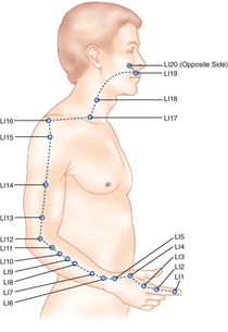 Large intestine’s physiologic functions that support your vitality and body hygiene by detoxifying the digestive system and subsequently relieving pain and congestion anywhere in the body, including the face, head, and neck. To achieve these welcomed health benefits the large intestine meridian does the following: